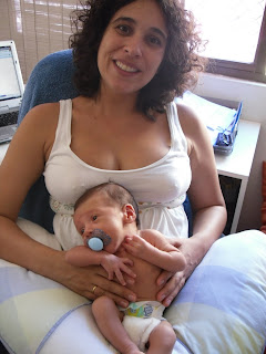 Vocês sabem bem que quando o neném nasce a rotina muda tanto que é difícil conseguir (pelo menos a mãe) uma foto que não seja descabelada, com olheira ou com a cara preocupada. Quando Davi estava com pouco mais de um mês, e minha irmã, Nadja, estava aqui em Salvador para visitá-lo, pegou a gente de surpresa numa foto! Achei a mais bonita (minha), desde que o pimpolho nasceu. Mas eu estava relutante, confesso, em colocá-la no blog. O motivo? Só porque Davi estava com chupeta! Me redimo publicando o clique da mana e morrendo de ri. No final o rapaz só pega a chupeta esporadicamente e descobriu o acessório como um brinquedinho, que ele segura enquanto está com o dedo na boca!