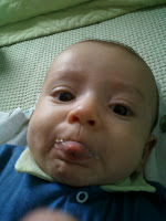 Tá bem! Todo recém-nascido coloca mesmo a linguinha pra fora. É um reflexo natural que dura praticamente até o desmame e que se intensifica quando a gengiva começa a coçar por causas dos dentes que irão nascer nos próximos meses. Mas hoje, aos quatro meses e 11 dias, Davi resolveu mostrar a língua para todo mundo, com direito a um sorrisinho desdentado no final. É só pra ficar registrado.