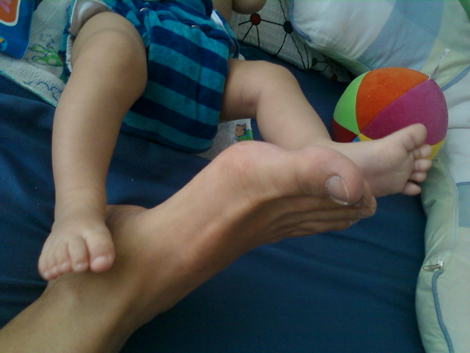 Como pé de moleque é bom demais (desculpem o trocadilho infame), vai uma foto do pezinho dele (muito maior do que quando chegou em casa, diga-se de passagem) comparado com o meu...!