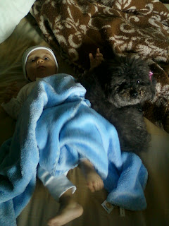 Nos dias de frio em BH, entre 8/10 e 20/10, uma babá especial me ajudou a tomar conta do Davi e se saiu muito bem! Jade, a poodle de meus pais que faz parte da família. A interação entre ela e o pimpolho foi bem maior que em julho, quando ele nem percebia a existência da cadelinha. Ela sim, percebia e tinha ciúmes do mimo de todos da casa irem para o bebê ... Eu deixava ela cheirar o pezinho do meu filhote para se familiarizar com ele.