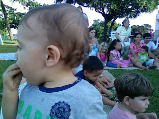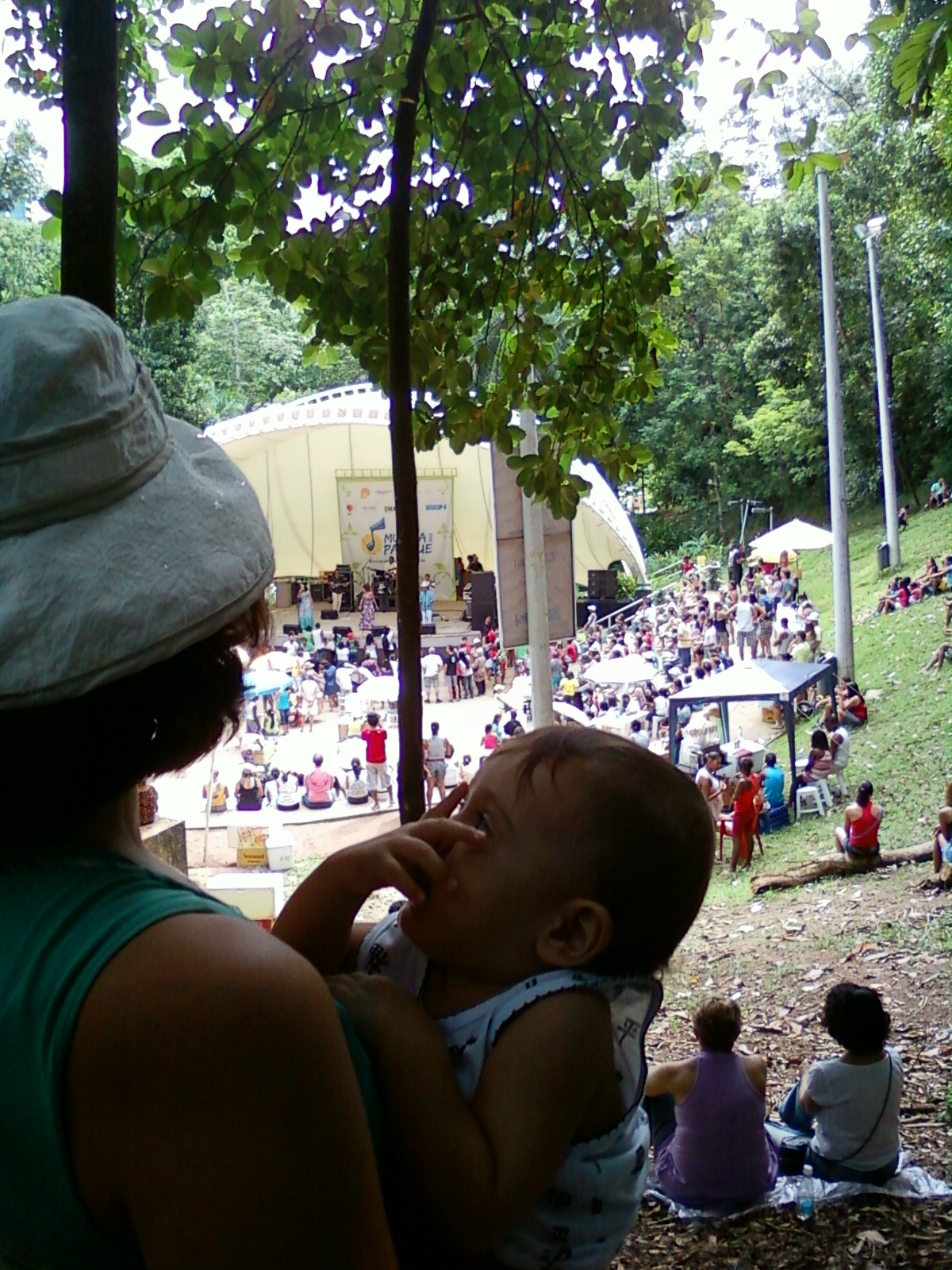 Domingo fomos ao projeto Música no Parque, no Parque da Cidade, assistir ao show Caimi em três tempos. Foi excelente programa. Apesar de termos ficado em uma ladeira, único local sem sol... ( o show começou às 11h). Davi se divertiu, dançou no meu colo e no do pai, no chão, sujou os pés de lama, interagiu com o público!