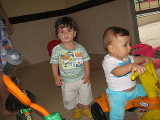 Bom, com as viagens e desencontros, ficamos praticamente dois meses sem nos ver e resolvermos colocar o papo em dia e matar a saudade. Impressionante como os meninos cresceram e se desenvolveram. Arthur está comprido e muito esperto, andando e correndo por tudo quanto é lado, subindo em mesa, energia pura. Davi, está mais gordinho, esperto, começando a dar os primeiros passos... Os dois se estranharam um pouco...Cada um querendo seus brinquedos, mas se reconheceram, se divertiram! Legal poder acompanhar o crescimento dos amiguinhos de perto!!! Espero que em alguns anos eles dêem boas gargalhadas com estas e outras fotos!!!