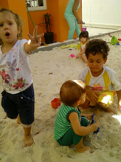 Em pouco tempo eles trocaram brinquedos, disputaram espaço, e nós, trocamos ideias com os pais de outras crianças.... Foi perfeito...Aliás, sentar na areia, fazer castelo, cavar, pisar na poça d´água, são momentos preciosos da primeira infância do filhote que não vou esquecer. No clique ele está com coleguinhas mais velhos, num dia que focou integral!